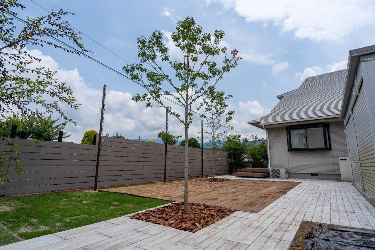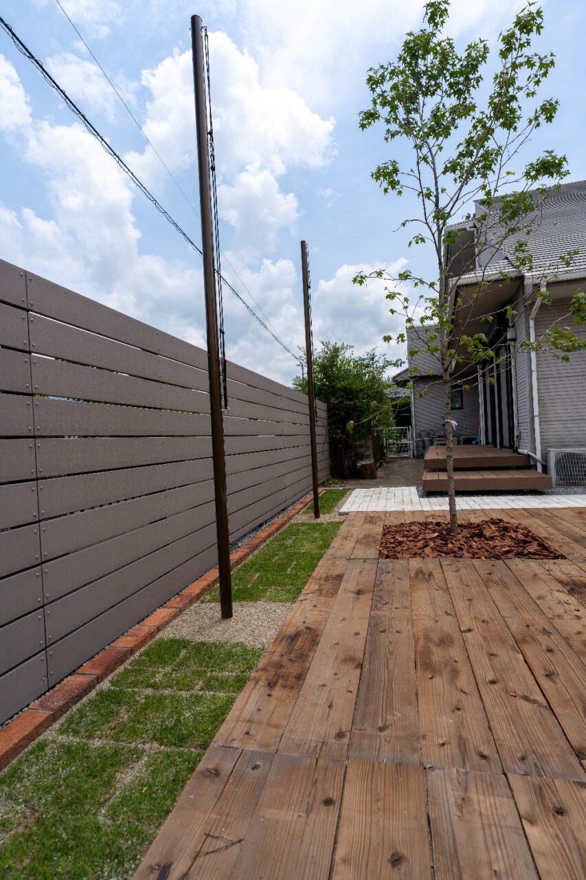 道路からの視線が気にならないよう、土新建材のエコモックフェンスを設置しました。また、あたたかみのある中庭デザインを心がけ、東洋工業のウィンテージウッドペイブを採用し、ナチュラルな空間を創り出しています。